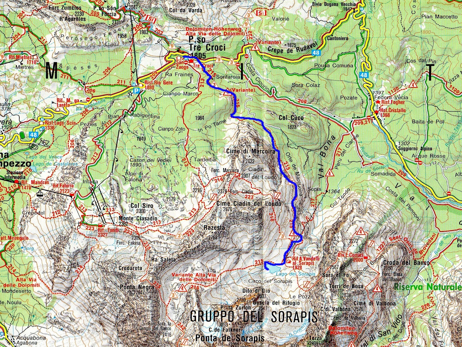 Характеристика маршрута: протяженность 6 км, перепад высот 215 м, идти 2:30 туда, 1:40 обратно. Хорошо маркированная тропа (#215 от Passo Tre Croce), есть участки, оборудованные железными поручнями и верёвками. Специального альпинистского снаряжения не требуется (это не феррата), но для боящихся высоты при прохождении некоторых участков рекомендуется пояс с карабином. Маршрут не считается архисложным, но не рекомендуется для прохождения с маленькими детьми и собаками. У озера расположено рефуджио Vandelli (1.928 м, http://www.rifugiovandelli.it/home.html ), где имеется ночлег и ресторан. К концу лета озеро может серьезно обмелеть. Идти лучше в солнечную погоду, тогда цвет воды будет фантастически изумрудный.